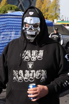 Il est 10h lorsque je m’acquitte en grimaçant des 35$ me donnant l’accès au parking de l’enceinte générale. Celui-ci est déjà en ébullition et les tailgates battent leur plein. Le moins que l’on puisse dire c’est que les fans sont grimés aux couleurs de leur équipe et ils rivalisent en déguisement de toute sorte teintés d’une forte connotation guerrière et quelque peu morbide. On ne compte plus les tête de mort ou autres squelettes. Je traîne d’allées en allées à l’affût des accoutrements de chacun. Il y a de la fumée de partout, cela sent la bierre et le barbecue, cela parle fort et les sanitaires en plastique disséminés sur le gigantesque parking sont des endroits forts fréquentés. Je fait un détour par le Raiders village où sont retransmis en direct les rencontres ayant déjà débutées sur la côte Est. Ils s’y déroulent de nombreuses animations du type séance de dédicace avec d’anciennes gloires, photos avec les Raiderettes ou distribution de produit de merchandising. J’y déguste un hot dog en gardant un œil sur le match Packers – Falcons.